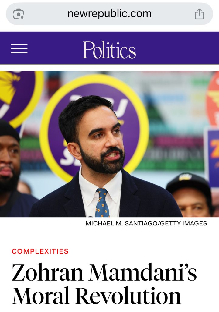 An inspiring article that captured my attention this week was by Audrey Clare Farley, in the New Republic, headlined “Zohran Mamdani’s Moral Revolution.” The young, newly elected mayor of New York, who was born in Uganda to Indian parents, has energized young voters like no other politician in recent years. Seventy-five percent of those aged 18-29, many of whom were voting for the first time, supported him. We hear a new, radical voice with a compelling message, a voice that is not afraid to frame the message in spiritual terms.